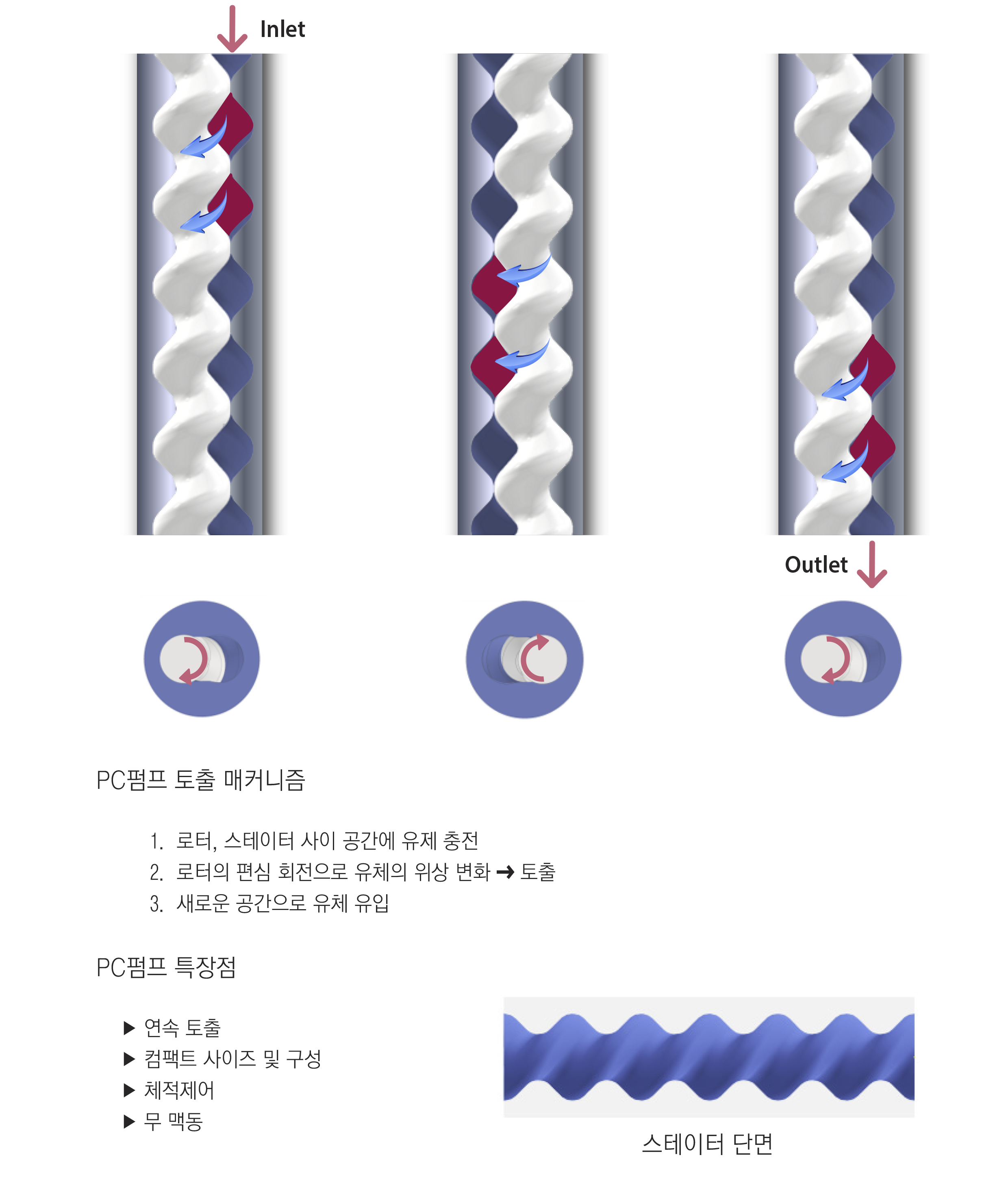 로터가 회전하면서, 로터&스테이터 사이의 빈공간(Cavity)의 유체를 연속적으로 다음 공간으로 밀어내는 방식의 펌프 시스템으로, 스테이터 내부 로터의 회전으로 토출과 밀폐가 연속적으로 동시에 이루어져, 편리모터 동작으로 토출/밀폐 제어가 가능합니다. 모터 RPM으로 토출 유량과 고점도 유체에도 적용 가능하며 부유물 포함한 유체에도 적용 가능.