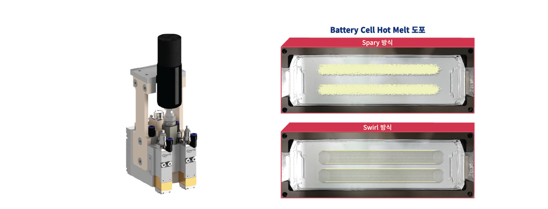 Hot Melt 소재는 물이나 용제를 전혀 사용하지 않고, 상온에서 100% 고체인 불휘발성.불연성.열가소성수지를 사용하는 무용제로써 인체에 무해하고 친환경적이며 화재 위험성이 없습니다. 고온에서 액상으로 피착재에 도포.압착 후 수초 내에 냉각.고화 되면서 접착력을 발휘하는 열용융형 접착제로 용제형 및 수용성 접착제에 비해 접착완료 시간이 빠르므로 고속작업이 가능합니다. 이러한 소재의 특성을 고려하여 선도포, Spray도포, Swirl 도포 등 다양한 패턴도포 기술을 제공하고, 고객 요구사항을 반영하여 다양한 솔루션을 제공하고 있습니다.