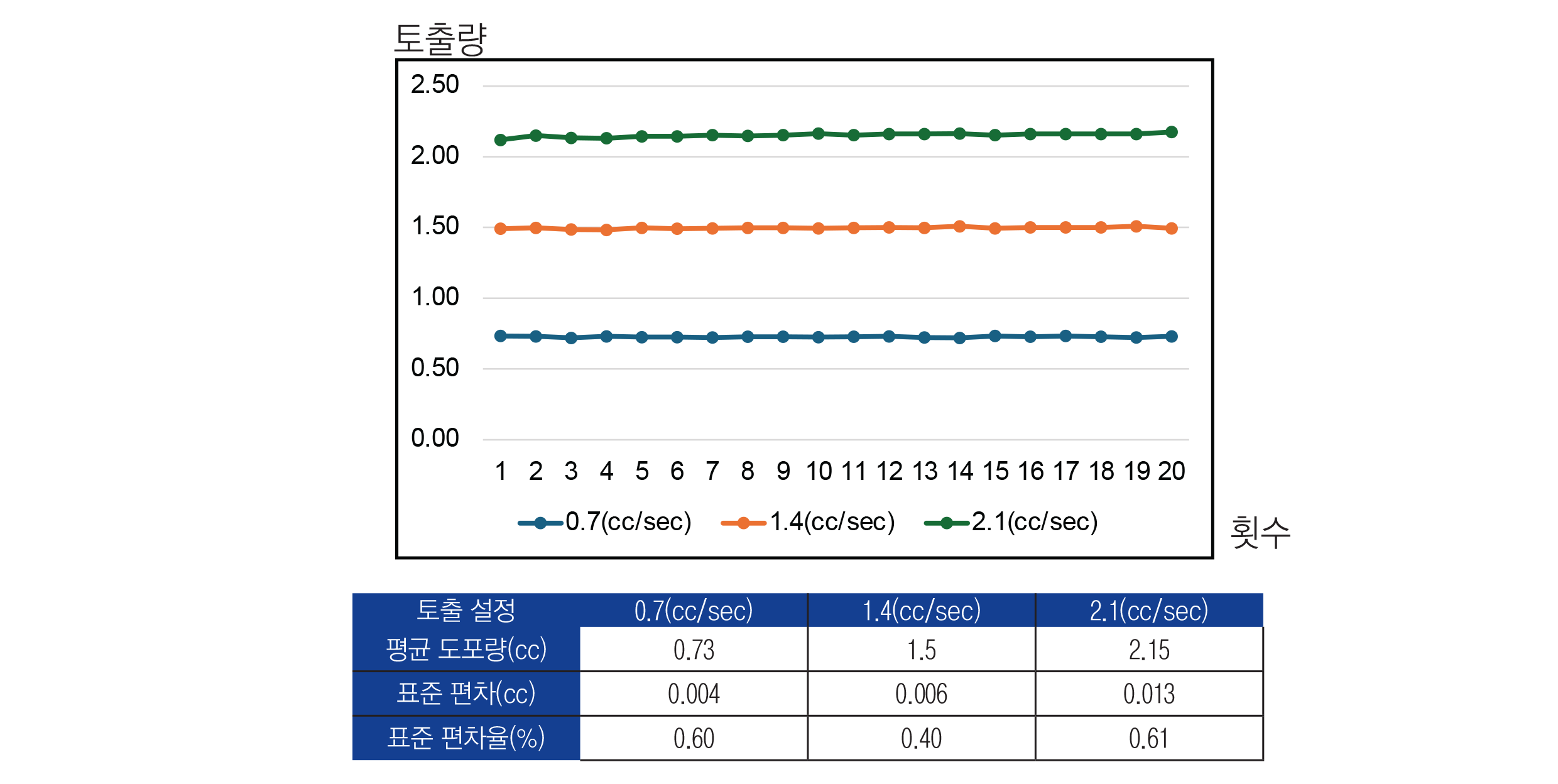 | 토출 정밀도 | 모터 정격 | 모터 RPM | 로터 RPM | 최대 토출 유량 |