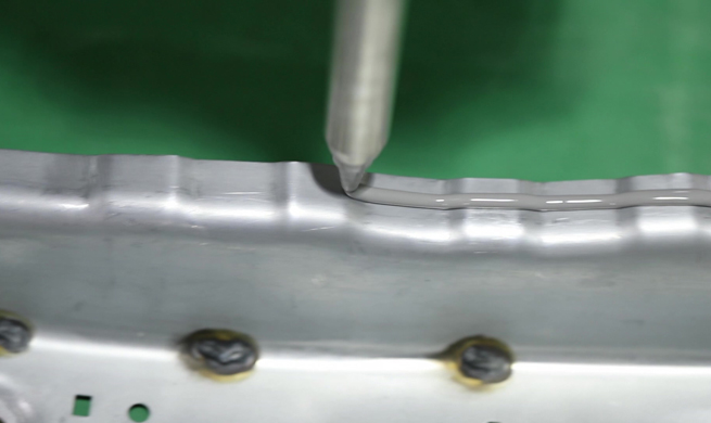 2K(이액형) 실링 방식은 주제와 경화제의 혼합으로 상온에서 자연 경화되어 기존 구조용실러로 적용 할 수 없었던 이종 재료에 대한 접합도 가능하게 되었으며 차체 생산시 에도 일부 적용하여 공정 이동중에 발생 할 수 있는 변형에 대한 방지의 용도로 적용 되고 있습니다.